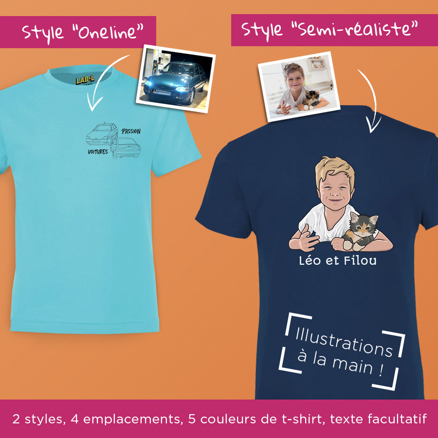 - Choisissez la taille du t-shirt / sa couleur / le style d’illustration / l’emplacement